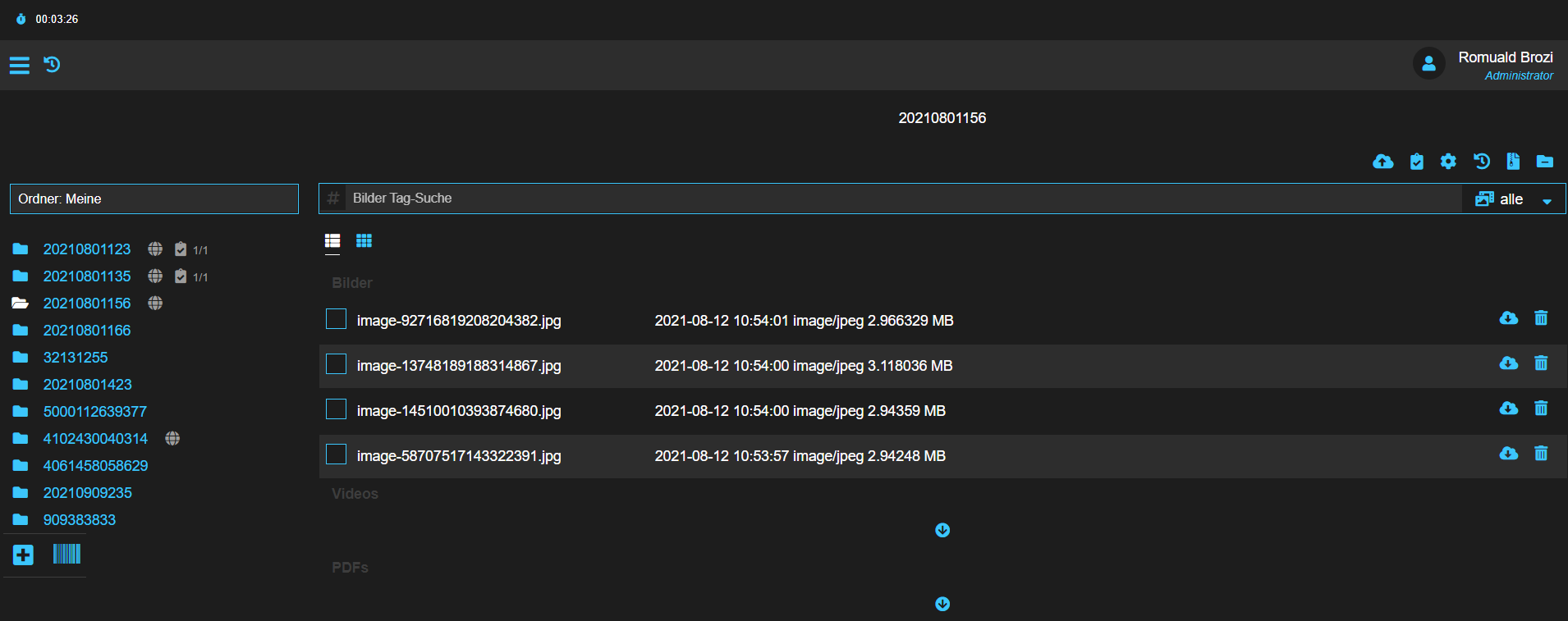 Die Auftragsverwaltung ist die Schaltzentrale. Hier kannst du neue Ordner bzw. Aufträge erfassen oder bestehende Ordner bearbeiten. Nicht nur Bilder und Videos sondern auch Dokumente kannst du hier hochladen oder direkt über dein Smartphone, Smartglas, Tablet oder PC, MAC oder Linux Rechner bereitstellen. Hashtags und Notizen kannst du ebenfalls erfassen oder nach allen Informationen Suchen. Einstellungen der Sichtbarkeit und andere Einstellungen kannst du hier auch vornehmen.